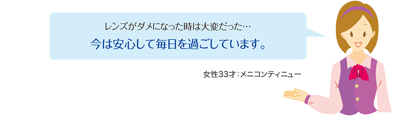 メルスプランでは、眼科医の判断により、ハードタイプのコンタクトレンズからソフトタイプのコンタクトレンズへの変更、 通常のコンタクトレンズから遠近両用コンタクトレンズへの変更も可能です。〈ご注意〉 コンタクトレンズの種類により月額費用が変更となる場合があります。